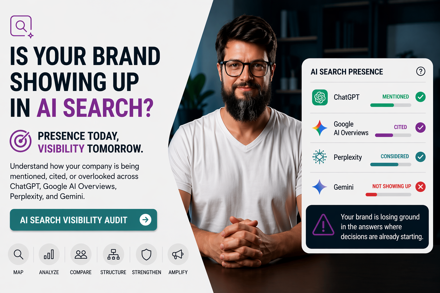 We identify which competitors are taking that space, how they are being cited, and where your brand is losing relevance by comparison.
